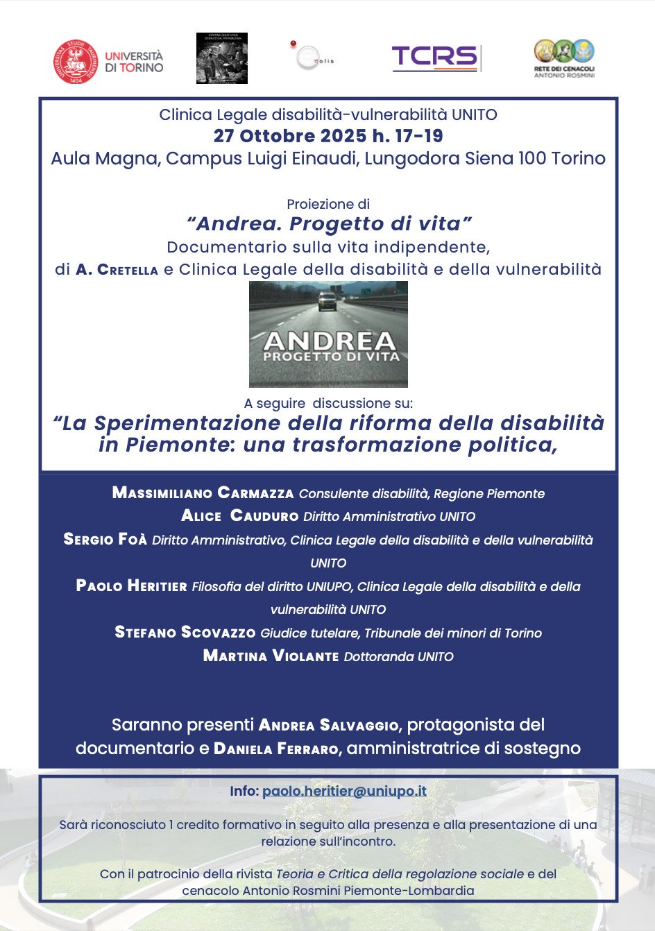 Proiezione di “Andrea. Progetto di vita”, Documentario sulla vita indipendente di A. Cretella e Clinica legale della disabilità e della vulnerabilità.